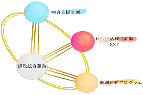 - 生活の中で、さまざまな遊びを通して学習できるよう環境を整える。また、障害の特性に配慮し、時間や空間を本人に分かりやすく構造化する。